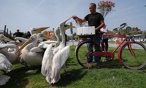 Tepeli pelikanları elleriyle besliyor!